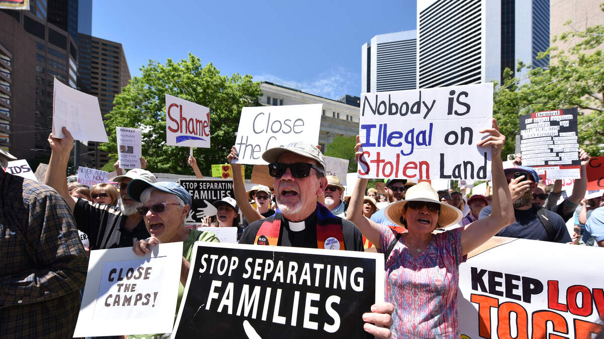 Moffett Field in Mountain View was surrounded by a rally of people on March 15 after they got word officials were thinking of housing unaccompanied migrant children at the facility. Many people showed up in solidarity with signs saying 'Kids Don't Belong In Cages', 'F*** ICE', and 'Stop Family Separation'.