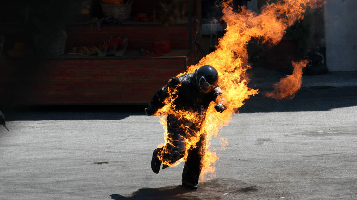 Criminals set themselves on fire as they ignite gasoline on a business.
